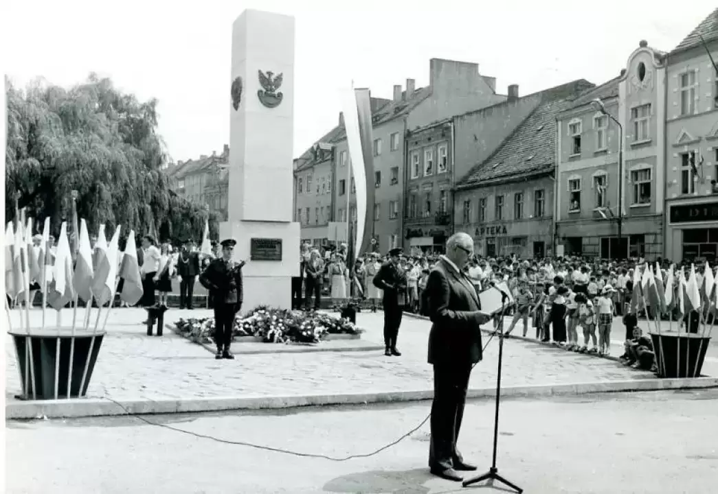 Do jego powstania wydatnie przyczynił się Władysław Kopacz, oficer WP w stanie spoczynku. Natomiast pan Tadeusz Kurpaski, nauczyciel historii w Liceum Ogólnokształcącym poparł budowę i wskazał miejsce, w Rynku - jako najbardziej godne na ten obelisk. I tak 14 lipca 1985 roku został pomnik odsłonięty, a potem poświęcony przez katolickich duchownych. Warto zaznaczyć, że przed pomnikiem odbywały się msze święte polowe. Podczas odsłonięcia pomnika Władysław Kopacz tak powiedział, przy wypełnionym przez średzian po brzegi Rynku: