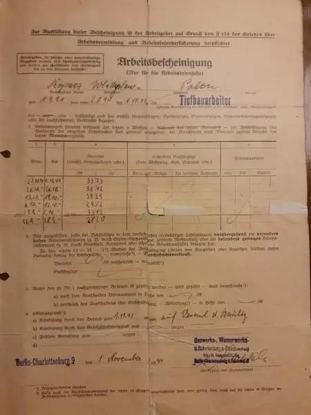 Za tydzień pracy (61 godzin), otrzymywaliśmy zapłatę 36 Reichsmark, ale potrącono z tego 12 RM jako podatek wojenny Kriegssteuer, 10 RM za ubranie i narzędzia, za wyżywienie 7,5 RM. Po odliczeniach to około 5 RM na rękę.