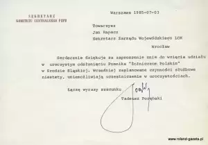 „Niechże obecne i następne pokolenia Polaków wiedzą, że w tym pomniku zawarte jest całe minione tysiąc lat Państwa Polskiego oraz życie wojów, rycerzy, żołnierzy legionistów, żołnierzy partyzantów, a także Żołnierzy Wojska Polskiego walczących o Polskę na wszystkich frontach, poległych i bestialsko pomordowanych przez okupantów z Zachodu jak i ze Wschodu.”