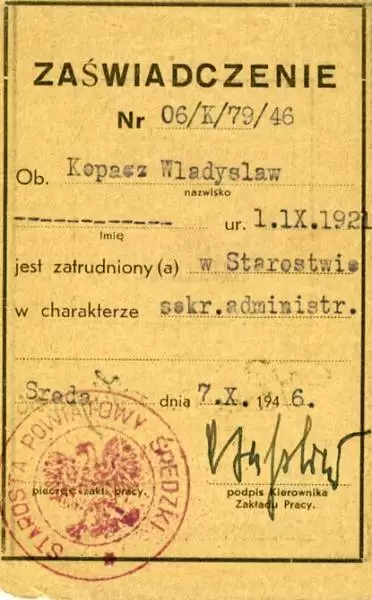 W lipcu 1945 roku Władysław Kopacz osiedla się po powrocie z niewoli niemieckiej w Środzie Śląskiej. A parę tygodni potem zaczyna pracować jako urzędnik w starostwie. I tym sposobem moja rodzina należy do najstarszych rodzin polskich - stale mieszkających w tym mieście.