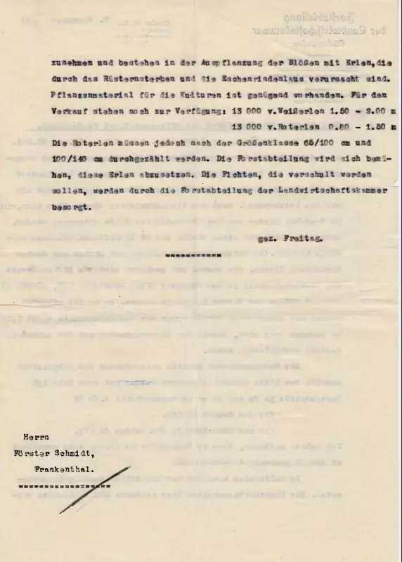 Leśniczemu Schmidtowi z Rackschutz, który był głównym leśniczym majątku von Kramsta od 1913 r. nakazano, aby ten problem rozwiązać poprzez wycinkę chorych drzew, a także zasadzenie w tych miejscach innych gatunków drzew odpornych na wspomniane choroby.