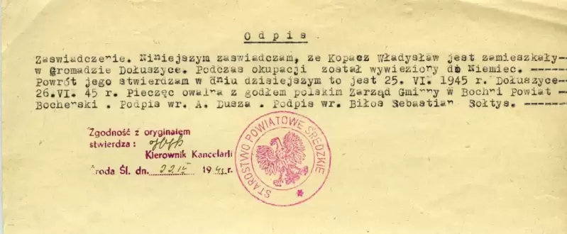 Władysław Kopacz, autor wspomnień, urodził się 1 września 1921 r. w Dołuszycach, wsi pod Bochnią. Żołnierz Armii Poznań, obrońca Lwowa w 1939 r. Po pięcioletnim pobycie w niemieckim obozie pracy, w czerwcu 1945 r. po raz pierwszy zjawia się w Środzie Śląskiej. Od lipca zaczyna pracować w Starostwie Powiatowym jako urzędnik. Na polecenie starosty, Władysława Gałuszki, w sierpniu 1945 r. opracował pierwszą polską mapę powiatu średzkiego!