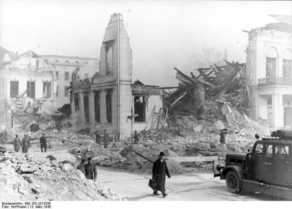 Z wielkim trudem wstaję. Nikt nikogo nie poznaje. Ale żyjemy. Cała ulica w gruzach i w ogniu. Słychać wołania o pomoc: Hilfe! Hilfe! Biegniemy w głąb ulicy. Nagle … Chryste! Ktoś wypycha przez okno od piwnicy małą dziewczynkę. Pali się. Ma nie więcej, jak cztery lata. Chcemy to dziecko wyciągnąć z ognia. Pali się jej rączka, a ona nawet nie płacze, tylko uśmiecha się do nas. Przez czapkę chwytam ją. Prawa ręka odpada od ciała. Po chwili kona na rękach kolegi, Serba (nazwiska nie pamiętam). Nagle krzyk - Uciekać! Uciekać! Runęła ściana kamienicy. Serb odskoczył, dziecko przygniótł ceglany gruz. Biegniemy do następnej kamienicy i odwalamy gruz od okienka piwnicznego. Kilof nic nie waży, taki wydaje się lekki. Robimy przekop do okienka. Jeszcze trochę gruzu i wreszcie mur. Poszerzamy otwór. Niemcy wołają: Jest tam kto? Słychać cieknącą wodę z pękniętych rur wodociągowych.