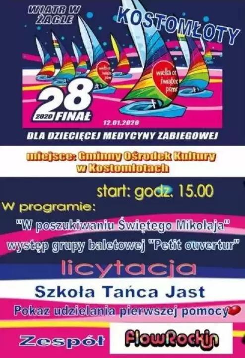 12 stycznia 2020 r. zapraszamy na 28. Finał Wielkiej Orkiestry Świątecznej Pomocy do Gminnego Ośrodka Kultury w Kostomłotach. Początek o godzinie 15:00.