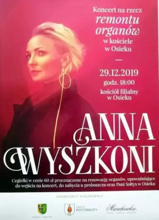 W kościele filialnym w Osieku 29.12.2019 r. o godzinie 18:00 wystąpi znana polska piosenkarka Anna Wiszkoni.