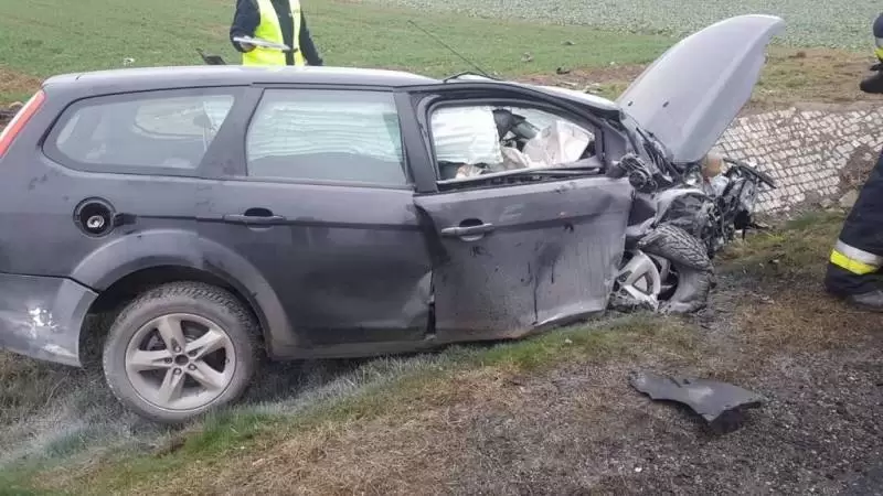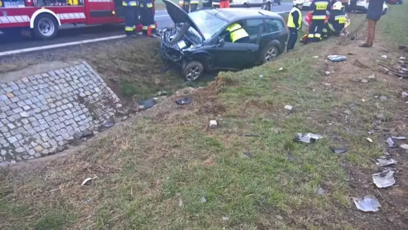 Dziś o godz. 14:04, na 377 km drogi krajowej nr 5, kierujący pojazdem marki Ford, jadąc w kierunku Strzegomia z niewyjaśnionych przyczyn uderzył w tył poprzedzającego go pojazdu marki Skoda, a następnie zjechał do przydrożnego rowu i uderzył w przepust drogowy.