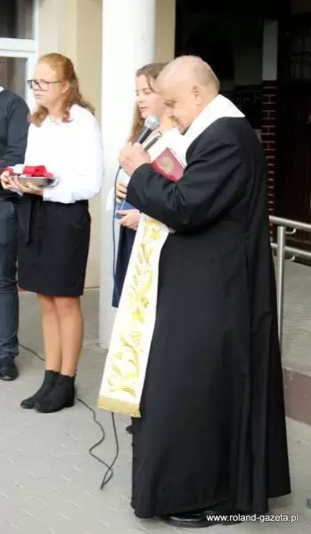Uroczystość rozpoczęto przed budynkiem szkolnym, gdzie przecięto symboliczną wstęgę oraz poświęcono budynek, wraz z tablicą.