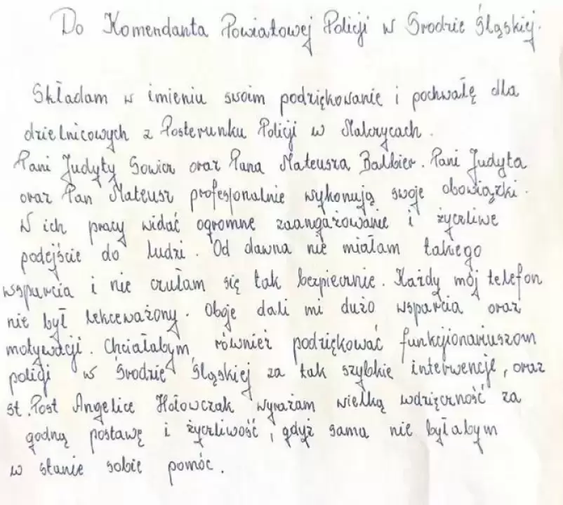 Na ręce Komendanta Powiatowego Policji w Środzie Śląskiej wpłynęły podziękowania i pochwała od mieszkanki powiatu średzkiego. Kobieta podkreśliła profesjonalizm, ogromne zaangażowanie oraz życzliwość dzielnicowych Posterunku Policji w Malczycach: mł. asp. Judyty Sowicz oraz st. sierż. Mateusza Balbiera, a także wobec policjantki Zespołu Dochodzeniowo-Śledczego st. post. Angeliki Hołowczak przy rozwiązaniu jej problemu związanego z trudną sytuacją rodzinną.