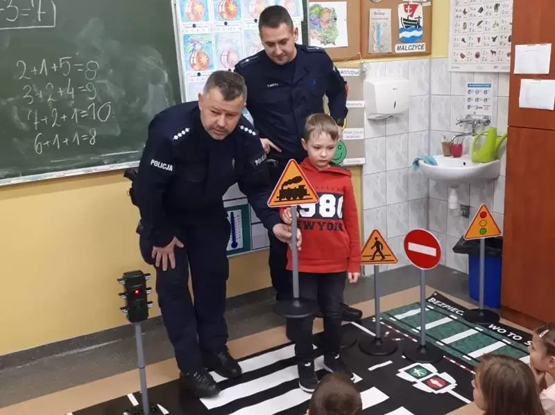 W kolejnych działaniach informacyjno-edukacyjnych wzięli udział uczniowie pierwszej klasy Szkoły Podstawowej w Malczycach, którzy pod okiem Kierownika Rewiru Dzielnicowych i asystenta Wydziału Prewencji, zapoznawali się z zasadami bezpiecznego przechodzenia przez jezdnię, właściwego poruszania się po drodze, w tym drodze dla rowerów. Policjanci omówili zasady obowiązujące przy przechodzeniu przez przejazdy kolejowe oraz wybrane znaki drogowe. Aby łatwiej było Naszym Skarbom zrozumieć przekazywane im informacje, policjanci korzystali z pozyskanych w ramach programu materiałów edukacyjnych takich, jak mata z przejściem dla pieszych i torami kolejowymi, znaki drogowe oraz sygnalizator świetlny.