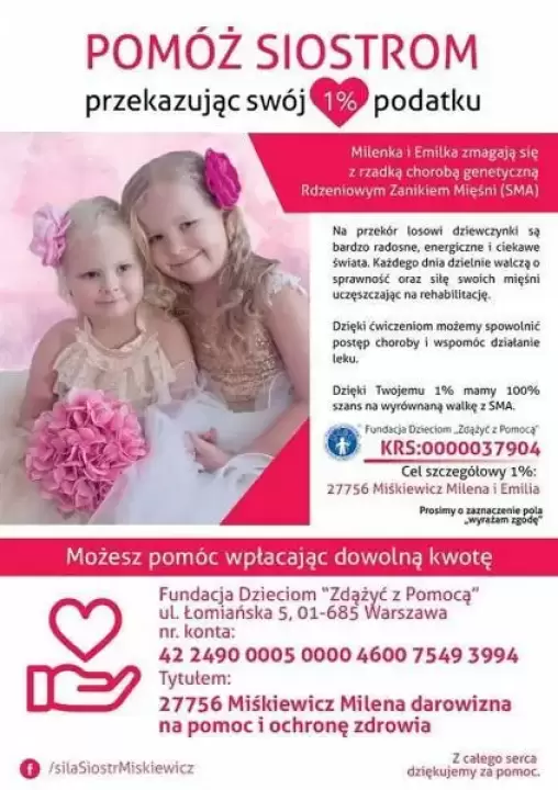 Dzięki Twojemu 1% mamy 100% szansę na wyrównaną walkę z SMA – czytamy na profilu społecznościowym dziewczynek, gdzie możemy śledzić losy tych małych, dzielnych wojowniczek.