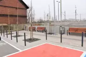 Po wschodniej stronie budynku powstał mini plac dworcowy z na nowo zaaranżowaną zielenią, małą architekturą (ławki, kosze, oświetlenie) oraz miejscami postojowymi dla osób z niepełnosprawnościami, rodzin z dziećmi oraz typu kiss&ride. Natomiast przy zachodniej elewacji parking dla samochodów oraz wiata rowerowa ze stojakami dla jednośladów. Obiekt jest bezpieczny, komfortowy i ma służyć mieszkańcom oraz podróżnym.