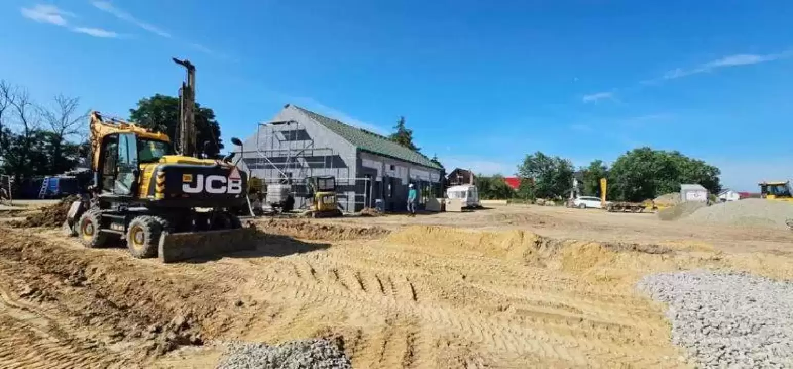 W ostatnich dniach zamontowano stolarkę okienną, trwają prace związane z wykonaniem elewacji budynku i pokrycia dachowego. W ramach zagospodarowania terenu prowadzone są prace ziemne związane z wykonaniem podbudowy pod nawierzchnię boiska. Rozpoczęto również odwierty pod źródło ciepła - pompy gruntowe.