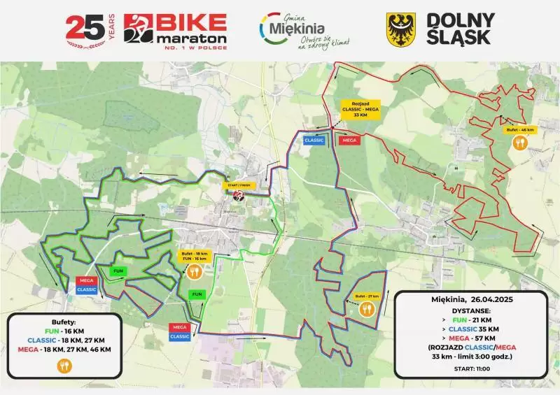 Trasy w Miękini będą w tym roku liczyć 21, 35 i 57 km. Start zawodów zaplanowany jest na godzinę 11:00. Po starcie wszystkich dystansów i wszystkich sektorów startowych rozpocznie się rywalizacja najmłodszych kolarzy, czyli PKO Ubezpieczenia Junior Race. Pierwsze starty od godziny 12:00.