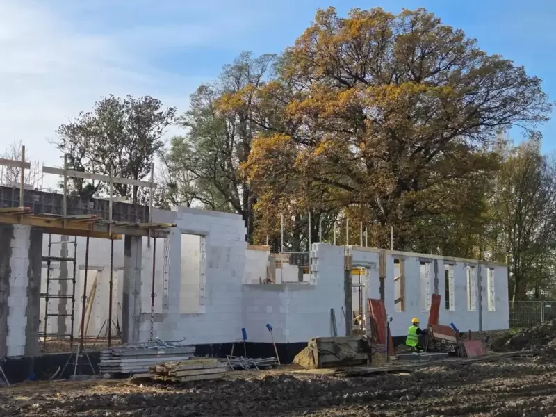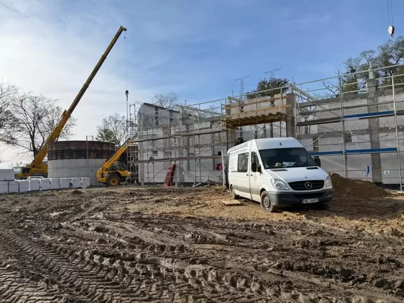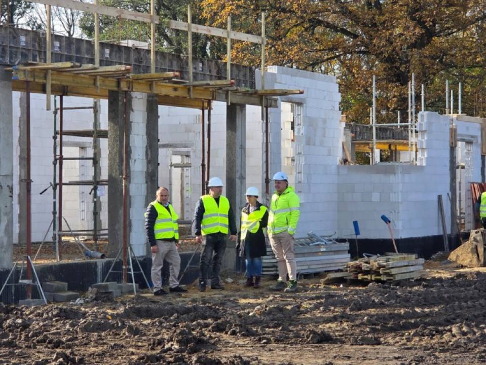 Trwają intensywne prace przy budowie zbiorników wody czystej i surowej. W budynku wykonano już instalacje podposadzkowe w części administracyjnej i technologicznej, a obecnie trwa wznoszenie ścian oraz montaż kratownicy pod konstrukcję dachu.