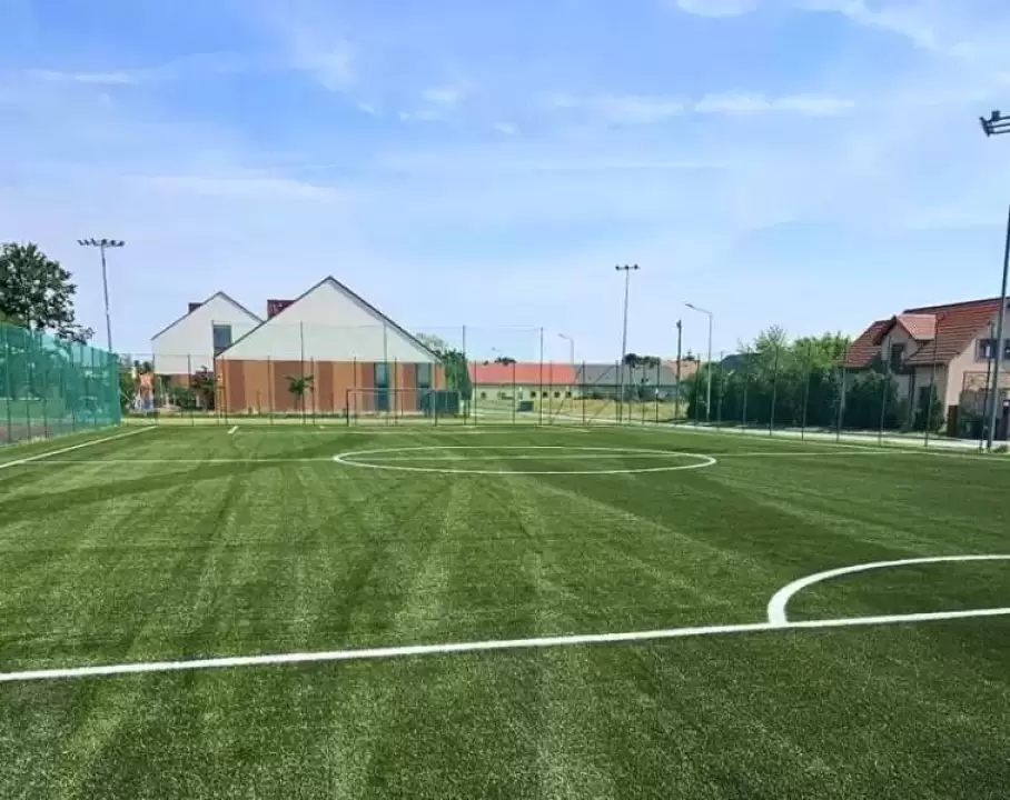 W ramach zadania wymianie podlega nawierzchnia z trawy, jak i ogrodzenie. Prace wykonuje firma DABRO-BAU.