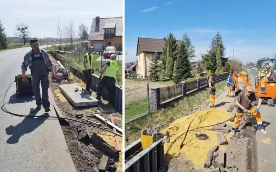 Dotychczas wykonano montaż fundamentów i słupów pod przyszłe oświetlenie i podbudowę pod chodnik.