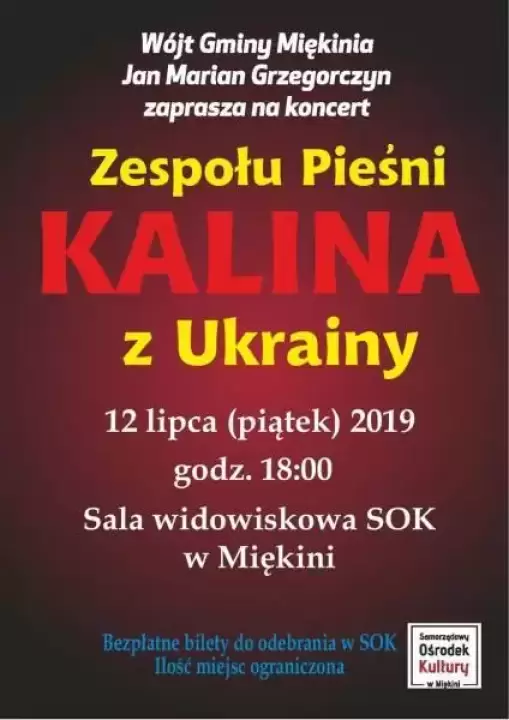 Wójt Gminy Miękinia Jan Marian Grzegorczyn zaprasza na koncert Zespołu Pieśni Kalina z Ukrainy, który odbędzie się 12 lipca (piątek) 2019 r. o godzinie 18:00 w sali widowiskowej w Samorządowego Ośrodka Kultury w Miękini.