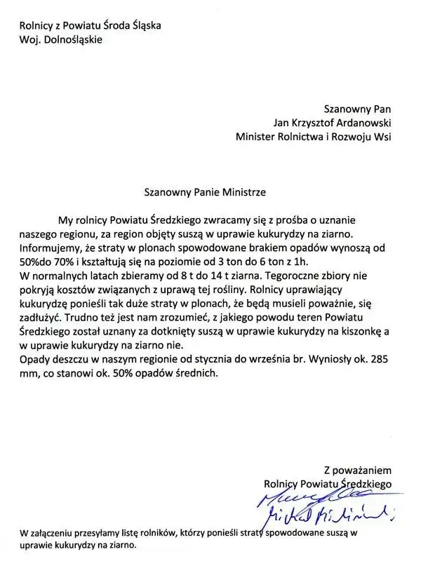 Rolnicy z terenu Powiatu Średzkiego chcą zwrócić się do Ministra Rolnictwa i Rozwoju wsi z prośbą o uznanie naszego regionu za objęty suszą w uprawie kukurydzy na ziarno.