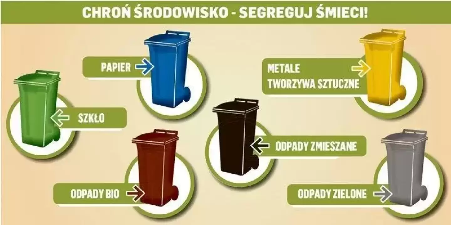Do niebieskiego pojemnika wrzucamy papier, do żółtego – metale i tworzywa sztuczne, do zielonego – szkło, do brązowego – odpady bio, zaś do czarnego – zmieszane. Sezonowo może pojawić się również szary kosz na tzw. zielone odpady, czyli na skoszoną trawę i liście.