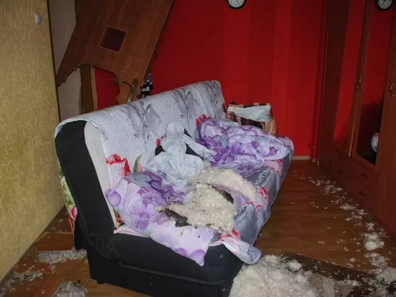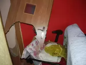 Szybka reakcja policjantów zapobiegła tragedii. Bowiem po wejściu do pokoju okazało się, że drzwi od wewnątrz były zabarykadowane za pomocą krzesła, za którym stała wersalka. Siedziała na niej kobieta, a przed nią znajdowała się 11-kilogramowa butla z gazem Propan-Butan, z której wydobywał się ogień skierowany w jej stronę.