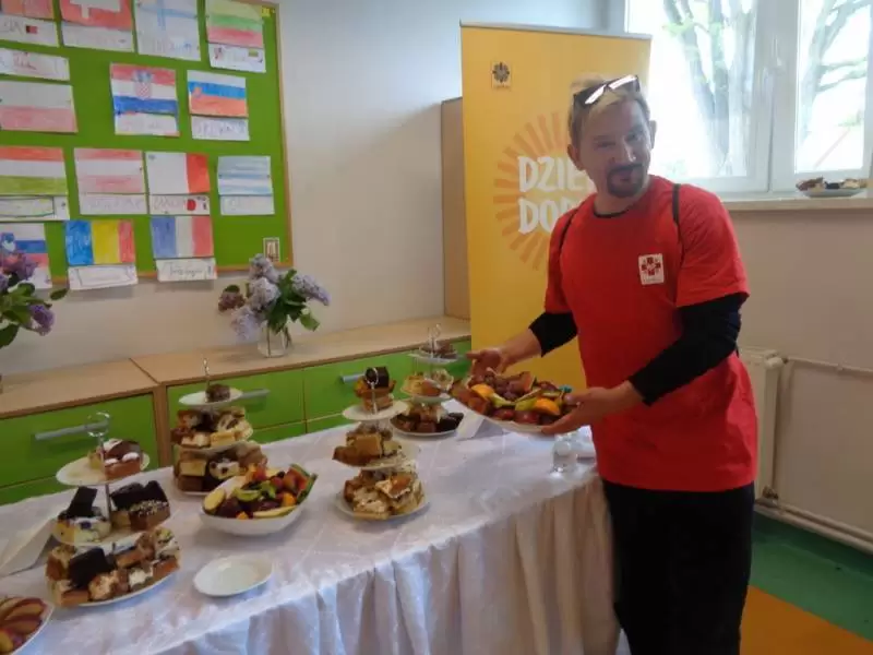 Po części oficjalnej wzięliśmy udział w warsztatach prowadzonych przez Straż Leśną, Straż Miejską, Straż Pożarną, Antyterrorystów, Pogotowie Ratunkowe, Wojska Obrony Terytorialnej oraz wolontariuszy – sanitariuszy ze Schroniska Brata Alberta we Wrocławiu. Nasi uczniowie mogli pogłaskać koniki straży miejskiej z Wrocławia, obejrzeć broń ręczną antyterrorystów, zapoznali się z zagadnieniami ochrony środowiska leśnego oraz zostali przeszkoleni z obsługi defibrylatora i udzielania pierwszej pomocy przedmedycznej. Zostaliśmy też ugoszczeni pyszną kawą, ciastami i owocami, przygotowanymi przez tutejsze Koło Gospodyń Wiejskich oraz kiełbaskami z grilla upieczonymi przez członków Caritas. Mieliśmy okazję spotkać się z innymi wolontariuszami oraz wymienić nasze doświadczenia z działalności kół noszących dobro, miłość bliźniego i pomoc potrzebującym.