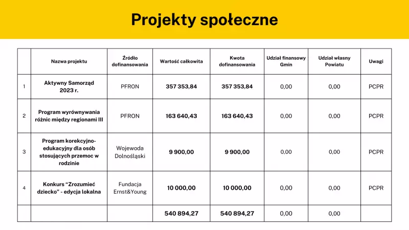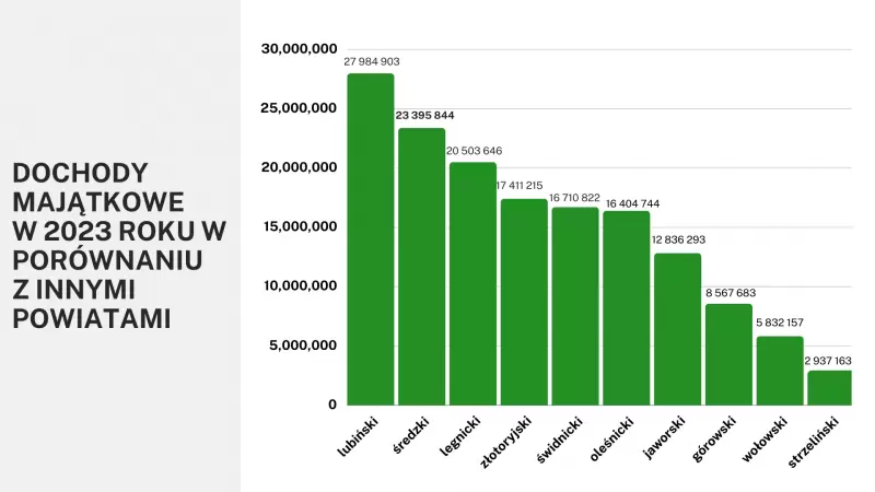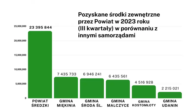 W 2023 roku Powiat realizował 30 projektów na łączną kwotę 87,8 mln zł i dofinansowaniu wynoszącym 54 mln zł. Te dane, osiągnięte dzięki współpracy z Gminami, zapewniły mu pierwsze miejsce wśród lokalnych samorządów pod względem wielkości pozyskanych i rozliczonych środków zewnętrznych w pierwszych trzech kwartałach 2023 r. W analogicznym zestawieniu obejmującym dolnośląskie powiaty nasz samorząd zajął drugie miejsce.