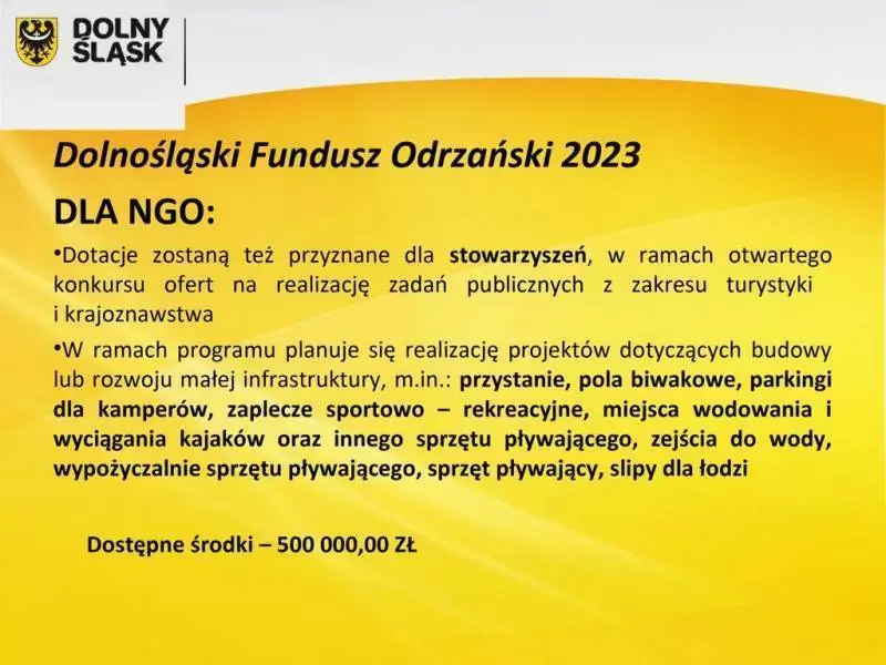 Od 1 do 21 marca 2023 r. gminy Dolnego Śląska, przez które przepływa Odra, lub które z Odrą sąsiadują mogą składać wnioski o dofinansowanie zadań polegających na budowie lub modernizacji małej infrastruktury turystycznej i/lub zakupie sprzętu turystycznego, służącego do uprawiania turystyki wodnej.