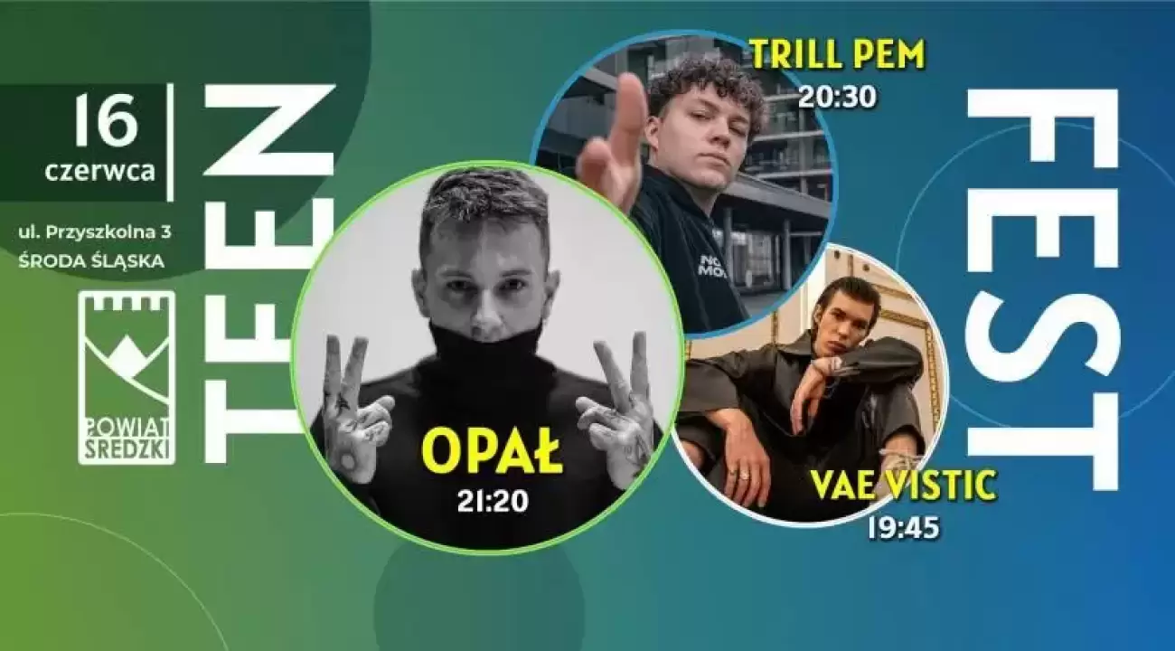 W piątek 16 czerwca odbędzie się druga edycja festiwalu dla młodzieży TeenFest organizowanego przez Powiat Średzki i jego partnerów. Na scenie wystąpią ogólnopolskie gwiazdy rapu - Vae Vistic, Trill Pem oraz Opał.