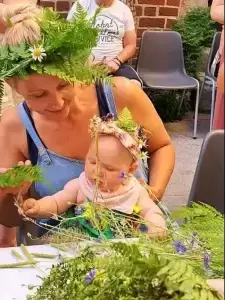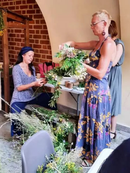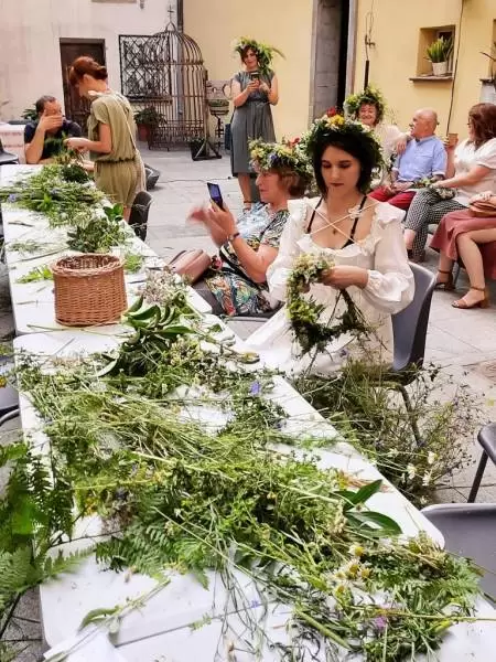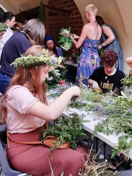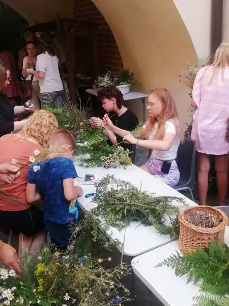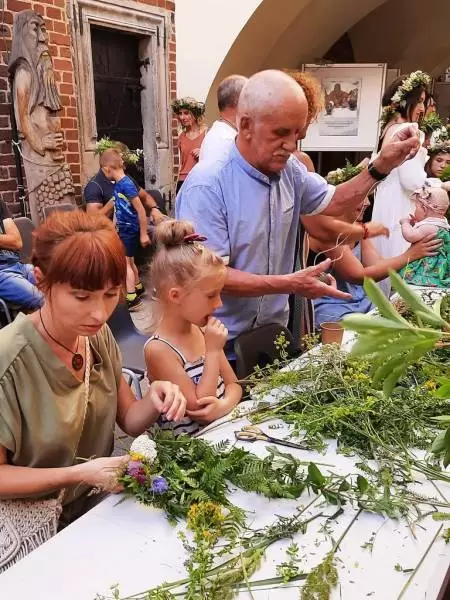 Dużym zainteresowaniem cieszyły się tematyczne warsztaty z plecenia wianków. Kwiaty do nich dobrane były nieprzypadkowo - postawiono na te, które pojawiały się w tradycyjnych ozdobach świętojańskich, m.in. bylicę, dziurawca czy lubczyk. Następnie nadszedł czas na wróżby. Panny stawały tyłem do drzewa i trzykrotnie rzucały wiankiem za siebie. Jeżeli za pierwszym razem zawisł na gałęziach znaczyło to, że wyjdą za mąż w ciągu roku, jeśli za drugim - w ciągu dwóch lat i analogicznie za trzecim - w ciągu trzech lat. Natomiast jeżeli kobieta nie trafiła w drzewko miałoby to oznaczać, że zostanie starą panną. W przypadku osób zamężnych zmieniały się jedynie intencje rzutu.