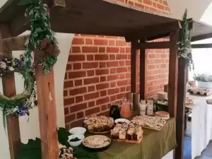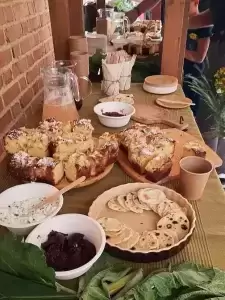 Jak zawsze na wydarzeniach organizowanych przez muzeum nie zabrakło pysznego poczęstunku. Tym razem na stołach pojawiły się tradycyjne podpłomyki z domowymi dżemami, twarożkiem i miodem, a także ciasto drożdżowe z rabarbarem i różyczki z ciasta francuskiego. Do picia przygotowano kwas chlebowy i kompot z rabarbaru.