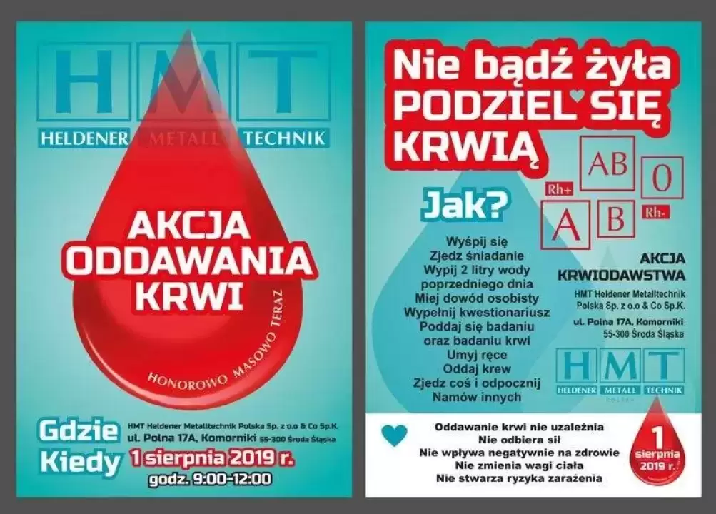 W porozumieniu z Regionalnym Centrum Krwiodawstwa i Krwiolecznictwa we Wrocławiu oraz Oddziałem Rejonowym PCK Środa Śląska, 1 sierpnia br. (w godzinach od 9.00 do 12.00) na terenie zakładu firmy HMT Polska zorganizowany zostanie mobilny punkt oddawania krwi - Krwiobus.