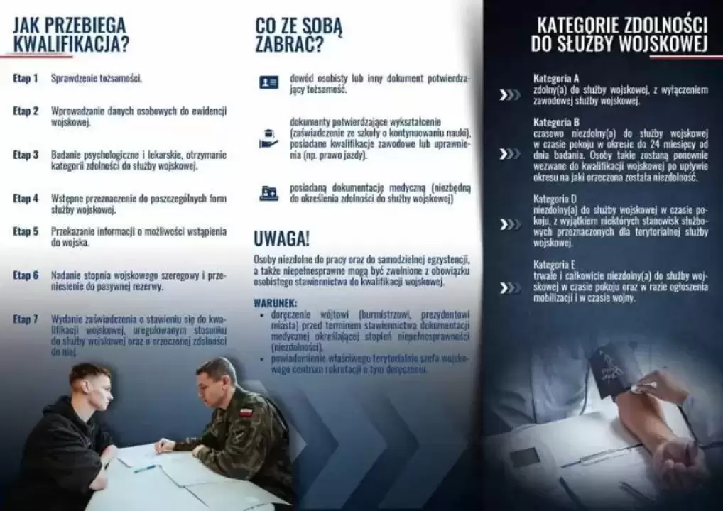Sprawdź na infografice jak przebiega #KW2025, co ze sobą zabrać i jakie są kategorie zdrowia do służby wojskowej.