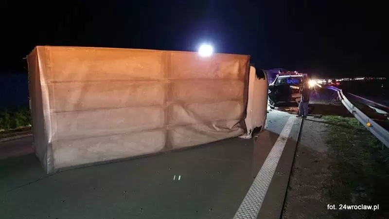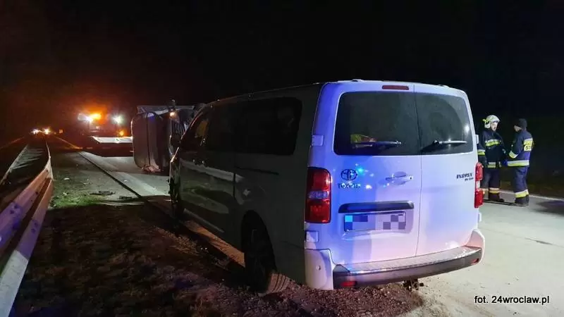 Dzisiaj nad ranem, na 117 km autostrady A4 w kierunku Wrocławia samochód dodtawczy wjechał w bariery i się przewrócił.