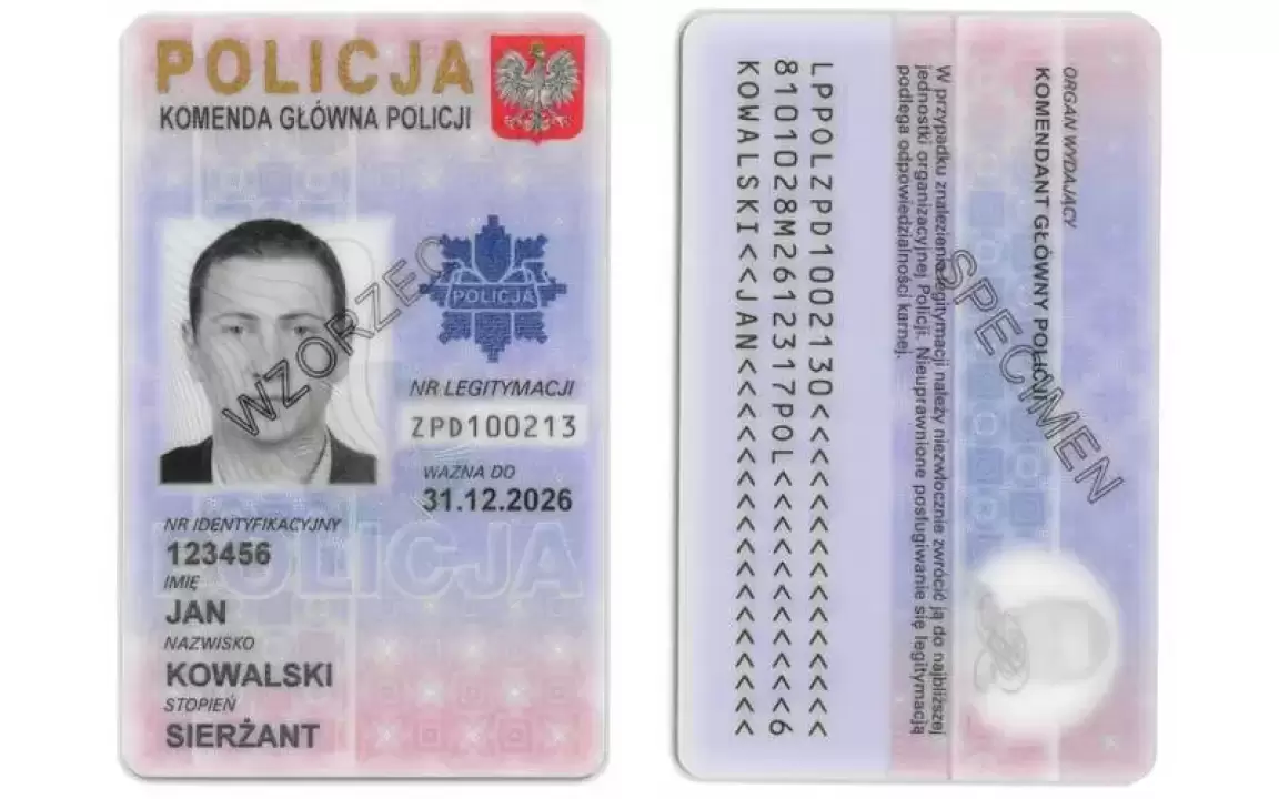 Wzór legitymacji służbowej policjanta obowiązujący w latach 2023 - 2026.