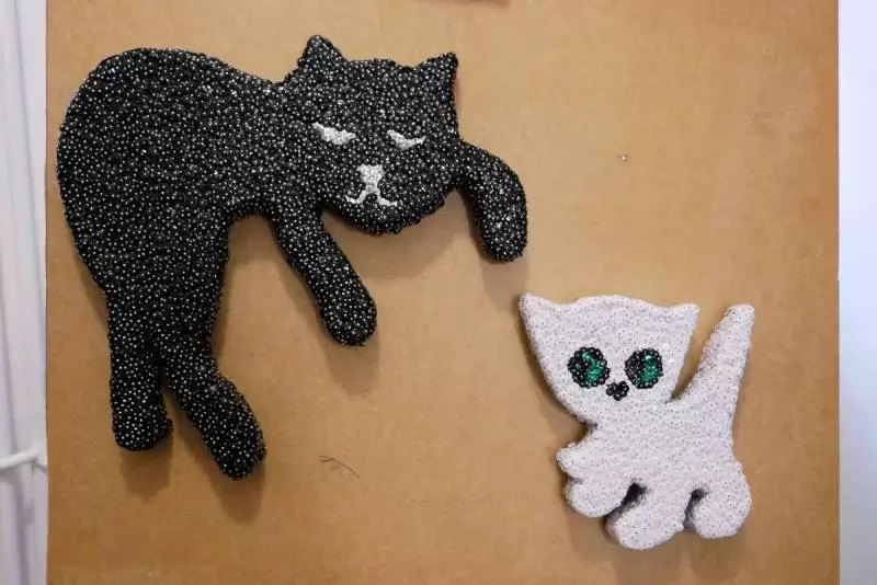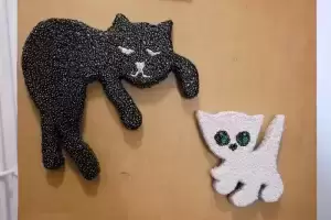 Z kolei w holu muzeum prezentowane są "Cekinowe koty", autorstwa Agnieszki Wróbel. Pani Agnieszka jest osobą niewidomą, jednak nie przeszkadza jej to w tworzeniu wyjątkowych dzieł.