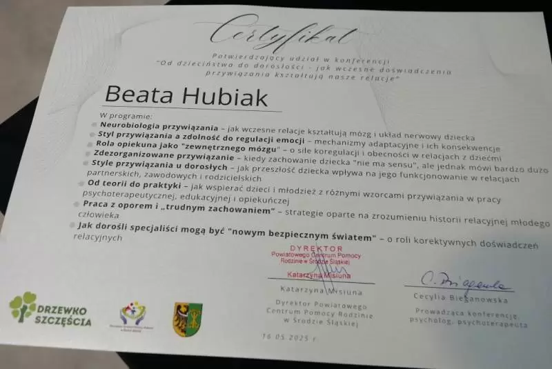 Dzięki współpracy Powiatowego Centrum Pomocy Rodzinie w Środzie Śląskiej i Fundacji Drzewko Szczęścia, 16 maja odbyła się konferencja pt. „Od dzieciństwa do dorosłości: jak wczesne doświadczenia przywiązania kształtują nasze relacje”.