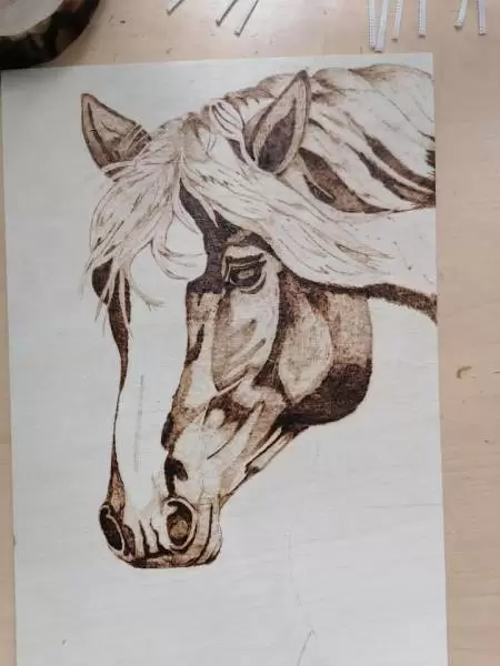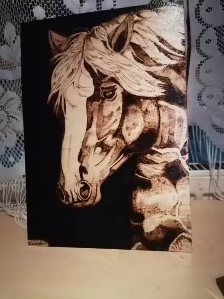 Malowanie ogniem to, mówiąc bardziej profesjonalnie - pirografia. Coraz mniej popularna sztuka wypalania różnych grafik na drewnie za pomocą specjalnego urządzenia z metalową końcówką rozgrzewaną prądem. Pani Ela z Ciechowa od półtora roku zajmuje się tym hobbystycznie. A wszystko zaczęło się od… koni.