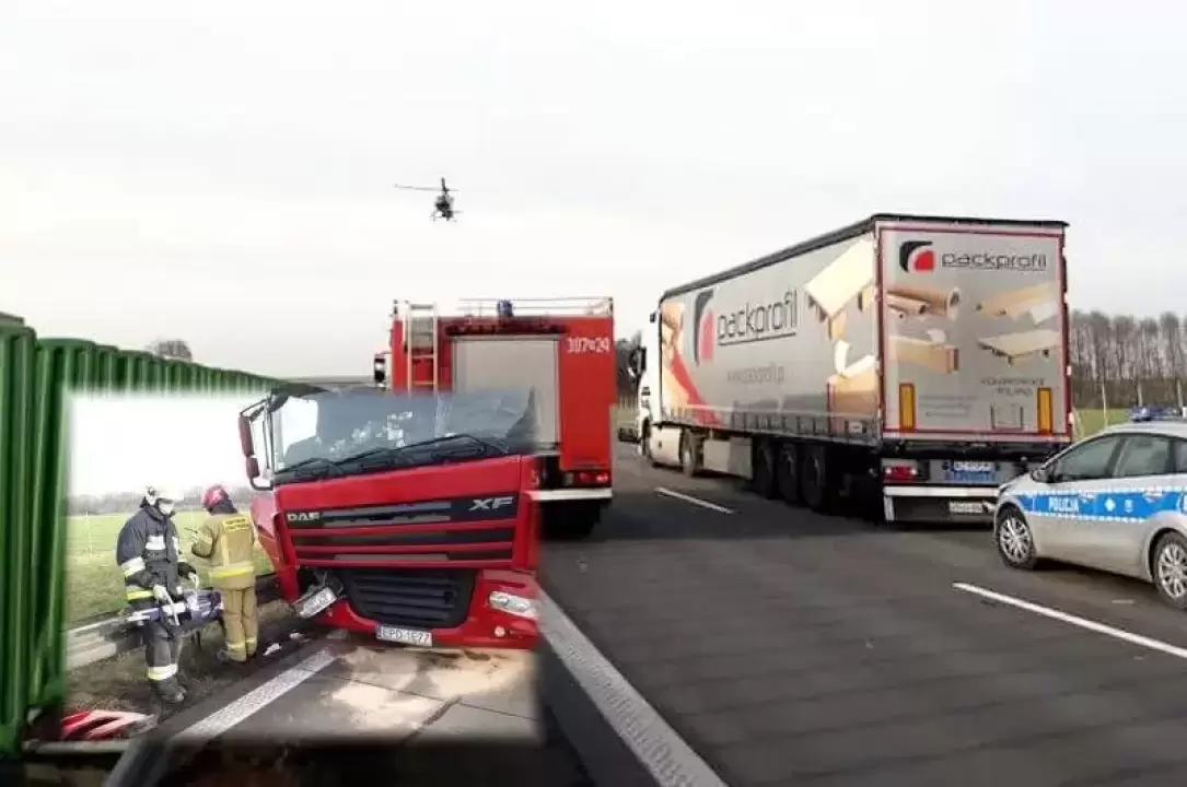 49-letni kierowca został uwięziony w kabinie swojego pojazdu. W wyniku gwałtownego hamowania ładunek, który przewoził, niebezpiecznie przesunął się. Pręty zbrojeniowe o wadze blisko 24 ton uderzyły w kabinę kierowcy powodując jej deformację i zablokowanie drzwi. Zdarzenie miało miejsce 14 grudnia około godz. 11:00.