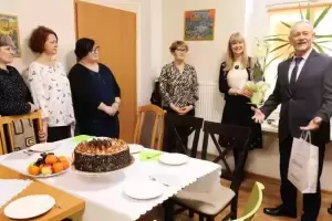 Starosta Powiatu Średzkiego Krzysztof Szałankiewicz oraz dyrektorka Powiatowego Zespołu Placówek Oświatowych Małgorzata Czerwiec wraz z pracownikami pożegnali dzisiaj odchodzącą na zasłużoną emeryturę Marię Bystrzanowską.