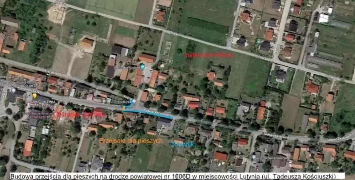 - budowa przejścia dla pieszych na drodze powiatowej nr 1606D w miejscowości Lutynia (ul. Tadeusza Kościuszki),