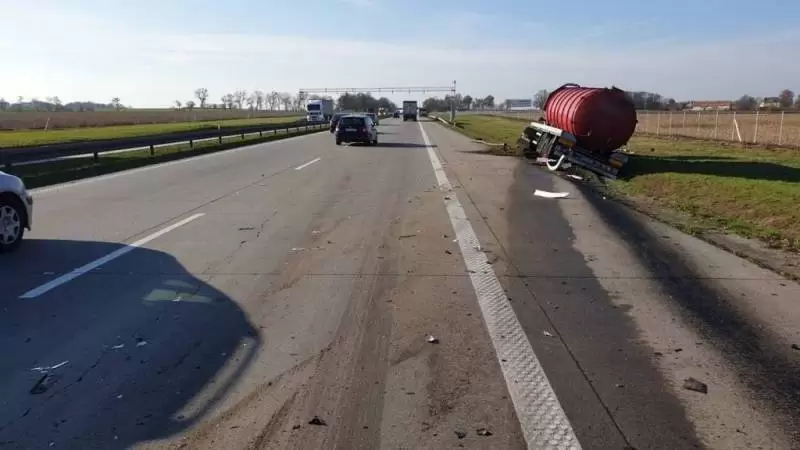 Jak by tego było mało, na 147 km autostrady, na pasie w kierunku Legnicy, kierujący cysterną uderzył w tył poprzedzającego go pojazdu. Wskutek zdarzenia ciężarówka wypadła z drogi. Kierowca cysterny, z urazami żeber, został zabrany do szpitala.