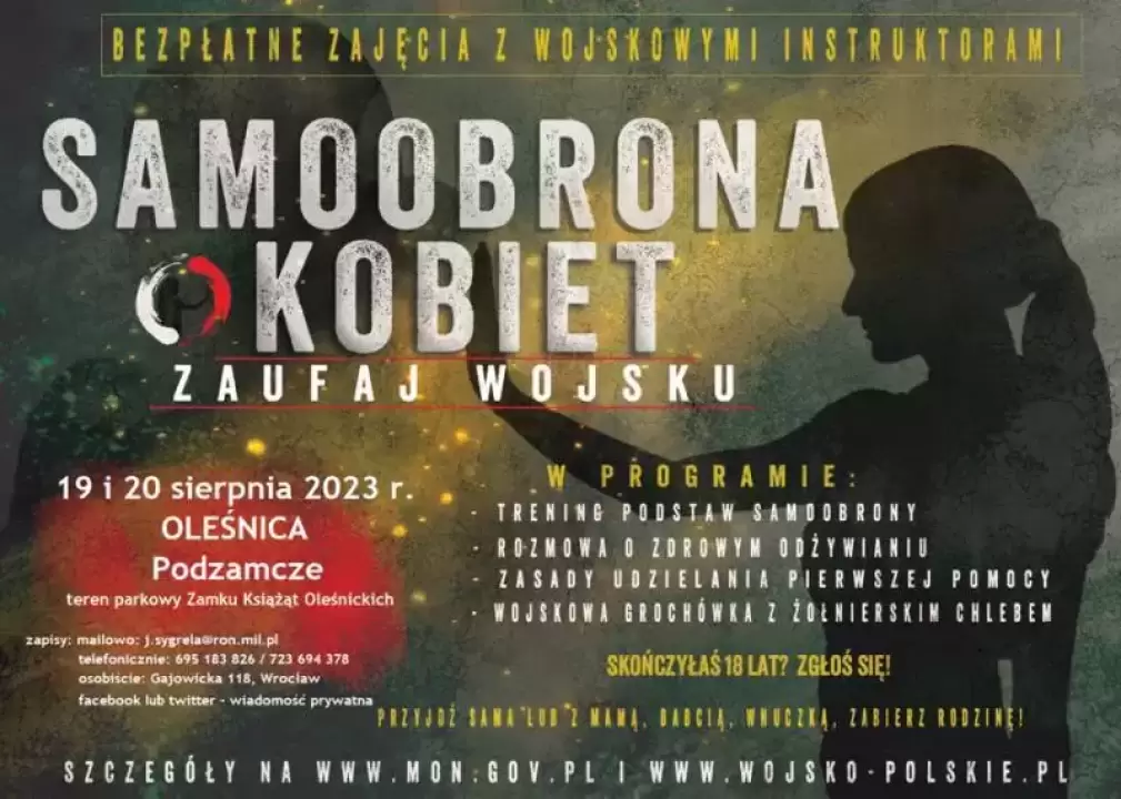 Ministerstwo Obrony Narodowej wraz z Centralnym Wojskowym Centrum Rekrutacji i Dowództwem Generalnym Rodzajów Sił Zbrojnych organizuje bezpłatne szkolenia z samoobrony dla dorosłych Polek. Szkolenia z doświadczonymi żołnierzami – instruktorami odbywać się będą w wybrane soboty i niedziele wiosną i latem w parkach miejskich, na plażach, w ośrodkach sportu i rekreacji na terenie całej Polski.