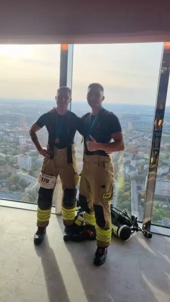 Strażacy mieli do pokonania 49 pięter (1142 schody) w ubraniu specjalnym i sprzęcie ochrony dróg oddechowych.