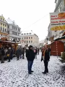 Görlitz powitało nas śnieżną aurą, ale temperatura powietrza była na tyle niska, że mróz nam nie dokuczał. Ulicą Berlińską udaliśmy się do zabytkowego centrum, po drodze obserwując piękne kamieniczki, wieże: Reichenbacherturm, Keisertrutz, Wołów i Najświętszej Marii Panny. Przy pięknym i ciekawym architektonicznie Domu towarowym zrobiliśmy sesję zdjęciową. Na placu Mariackim zauważyliśmy szopkę z Trzema Królami oraz stoiska z lokalnymi smakołykami.