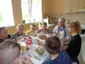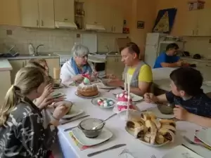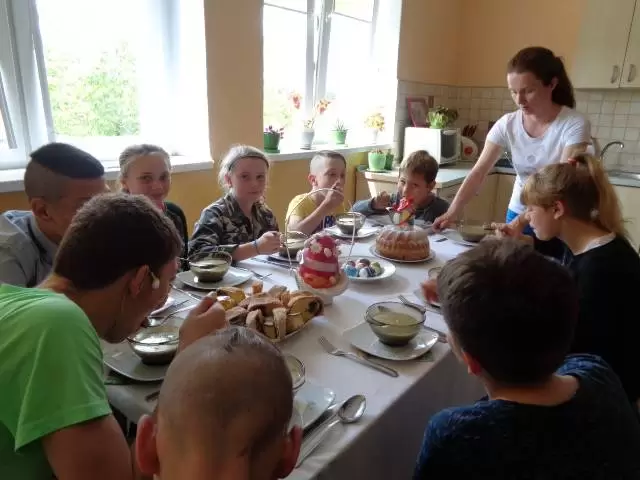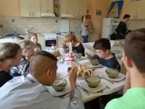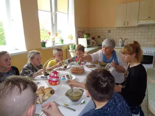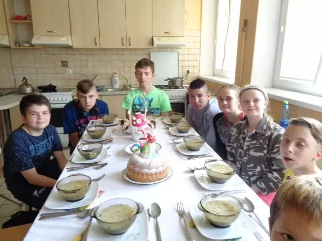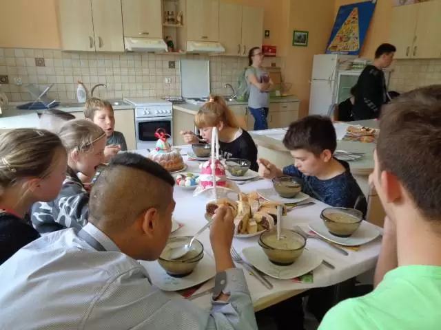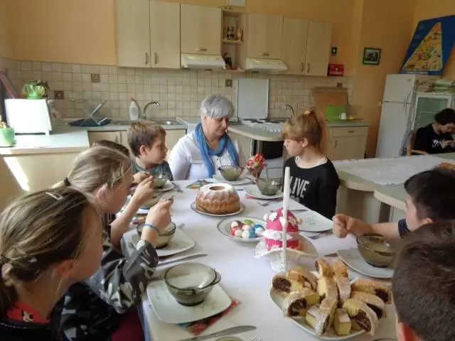 Atmosfera przy stole była rodzinna, a nasi podopieczni pokazali, iż zasady zachowania się przy stole nie są im obce. Po posiłku rozmawialiśmy o zwyczajach wielkanocnych w naszych domach i rozdaliśmy wszystkim dzieciom czekoladowe jajeczka.