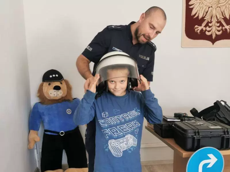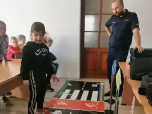Następnym etapem spotkania była możliwość założenia przez zwiedzających umundurowania typu „PZ” oraz zapoznanie z codziennym wyposażeniem policjanta. Spotkanie było również okazją do przypomnienia zasad bezpiecznego poruszania się po drodze z użyciem maty oraz mini znaków drogowych.