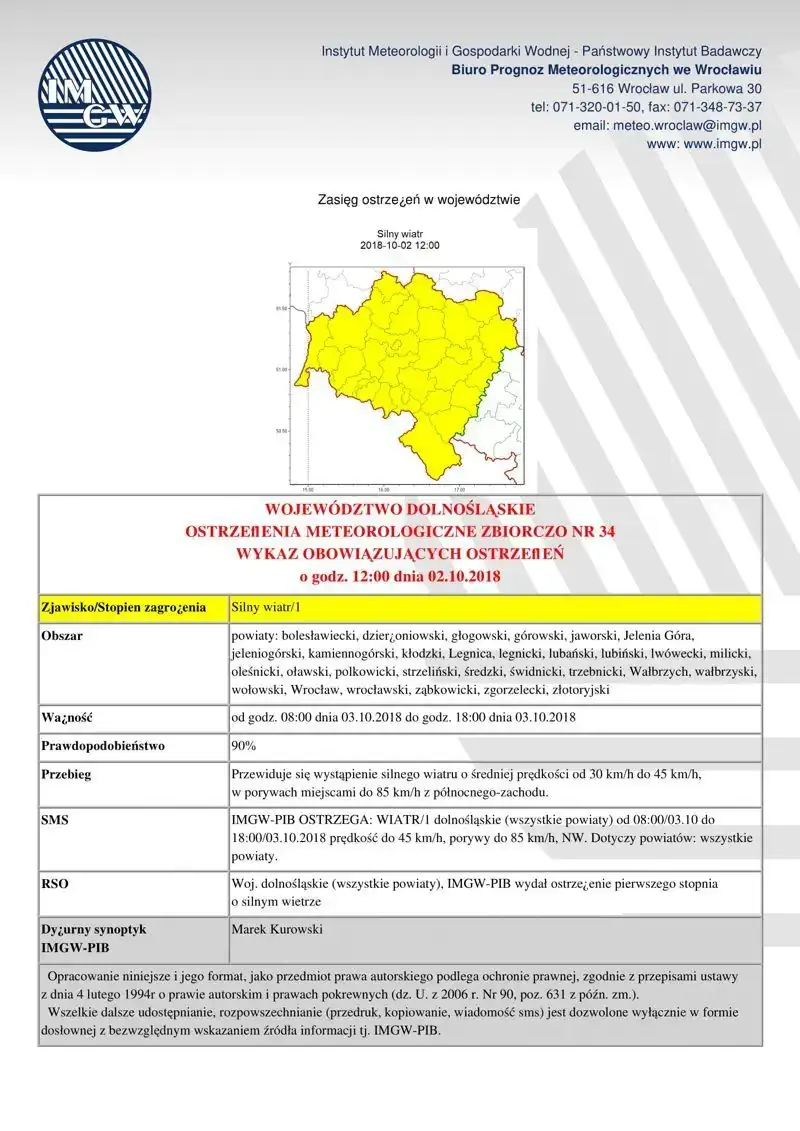3 października br. na terenie powiatu Średzkiego możemy spodziewać się wystąpienia silnego wiatru o średniej prędkości od 30 km/h do 45 km/h, miejscami w porywach do 85 km/h. Wiatr wiać będzie od północno - zachodniej części kraju.
