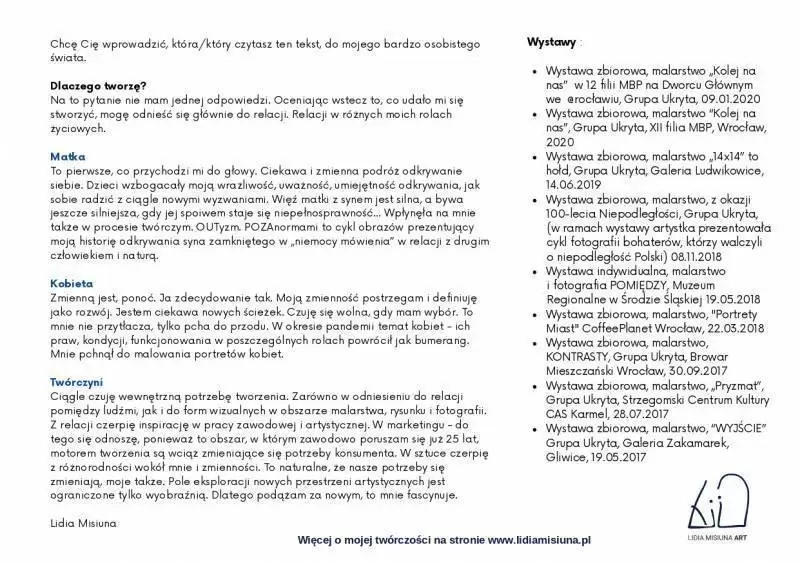 Lidia Misiuna to średzka malarka, fotograficzka, z dużym dorobkiem artystycznym. Jest autorką wielu wystaw, na przestrzeni lat jej obrazy i zdjęcia zagościły m.in. w średzkim Muzeum Regionalnym, we wrocławskich galeriach sztuki, w Strzegomskim Centrum Kultury, Galerii Ludwikowach oraz Galerii Zakamarek w Gliwice. O sobie jako artystce mówi, że jest jednocześnie Matką, Kobietą, Twórczynią i Człowiekiem. Na pytanie, dlaczego tworzy, autorka nie ma jednej odpowiedzi. Dla swojej twórczości znajduje wspólny mianownik – relacje, zwłaszcza te międzyludzkie i w różnych rolach życiowych. Podczas piątkowego wernisażu w PCeKA artystka odpowie na pytania dotyczące jej samej oraz własnej twórczości.