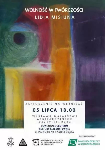 Powiatowe Centrum Kultury Alternatywnej w Środzie Śląskiej ma przyjemność zaprosić na wyjątkową wystawę „Wolność w twórczości” ze zbiorów Lidii Misiuny. Wernisaż odbędzie się w najbliższy piątek 5 lipca o godzinie 18:00 w Kawiarence PCeKA (ul. Przyszkolna 3).