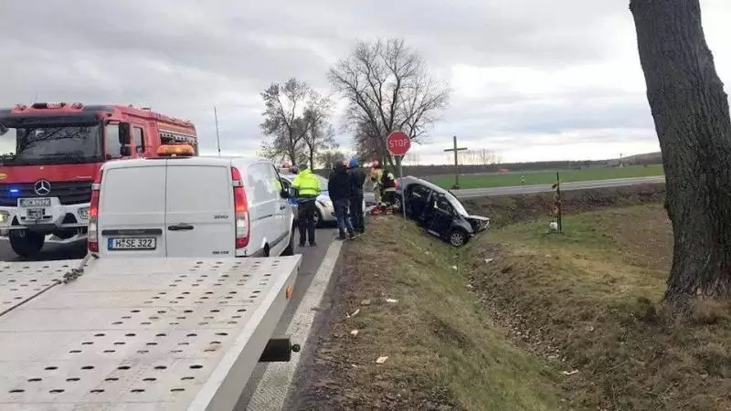 Jadący od strony Żarowa kierowca samochodu osobowego marki Volkswagen Passat nie ustąpił pierwszeństwa jadącemu pojazdem marki Kia, który na skutek uderzenia wpadł do przydrożnego rowu. Poszkodowany pasażer oraz kierowca zostali zabrani do szpitala.